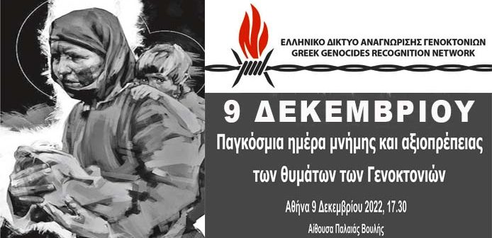 Το Ελληνικό Δίκτυο Αναγνώρισης Γενοκτονιών, οργανώνει φέτος μεγάλη εκδήλωση στην Παλαιά Βουλή, στην Αθήνα, στις 9 Δεκεμβρίου, που έχει οριστεί από τον ΟΗΕ ως «ημέρα μνήμης και αξιοπρέπειας των θυμάτων των Γενοκτονιών και αποτροπής του εγκλήματος της Γενοκτονίας».