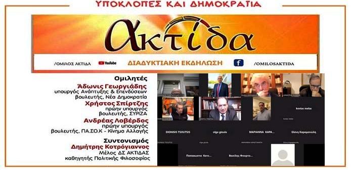 Με επιτυχία πραγματοποιήθηκε την Δευτέρα 5 Δεκεμβρίου 2022 η διαδικτυακή εκδήλωση – συζήτηση, που διοργάνωσε ο όμιλος πολιτικής σκέψης και δράσης ΑΚΤΙΔΑ, με θέμα ” Υποκλοπές και Δημοκρατία ” εξαιτίας των σχετικών γεγονότων, που απασχολούν την πολιτική συζήτηση, την κοινωνία και γενικότερα τον δημόσιο χώρο.