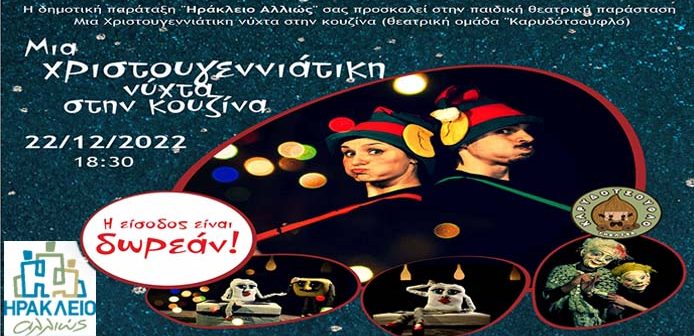 Η δημοτική παράταξη «Ηράκλειο Αλλιώς» και ο υποψήφιος Δήμαρχος, Νίκος Μπαρμπούνης σας προσκαλούν στην παιδική θεατρική παράσταση «Μια Χριστουγεννιάτικη Νύχτα στην Κουζίνα», την Πέμπτη, 22 Δεκεμβρίου 2022, στις 18:30, στο Πολύκεντρο Ηλέκτρα Αποστόλου