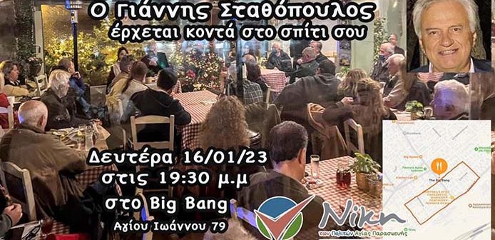 Ο Γιάννης Σταθόπουλος, Δήμαρχος 2014-19 και επικεφαλής της Ανεξάρτητης Δημοτικής Κίνησης «ΝΙΚΗ των ΠΟΛΙΤΩΝ Αγ. Παρασκευής», διοργανώνει συναντήσεις στις γειτονιές της πόλης (4-5 οικοδομικά τετράγωνα) για να διαμορφώσει, μαζί με τους πολίτες, το πρόγραμμα του Δήμου μας για την επόμενη πενταετία.