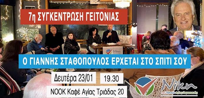 Ο Γιάννης Σταθόπουλος, Δήμαρχος 2014-19 και επικεφαλής της Ανεξάρτητης Δημοτικής Κίνησης «ΝΙΚΗ των ΠΟΛΙΤΩΝ Αγ. Παρασκευής», διοργανώνει συναντήσεις στις γειτονιές της πόλης (4-5 οικοδομικά τετράγωνα) για να διαμορφώσει, μαζί με τους πολίτες, το πρόγραμμα του Δήμου μας για την επόμενη πενταετία.