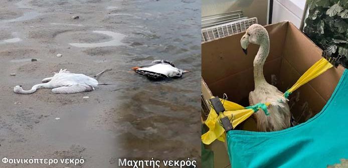 Δυστυχώς εντόπισαν ένας νεκρό μαχητή (Philomachus pugnax) και ένα νεκρό φοινικόπτερo (Phoenicopterus ruber), ενώ περισυνέλλεξαν ένα νεαρό φοινικόπτερο με σοβαρά τραύματα στο σώμα και στη φτερούγα το οποίο έστειλαν στο Σύλλογο Προστασίας και Περίθαλψης Άγριας Ζωής ΑΝΙΜΑ στην Αθήνα, όπου περιθάλπτηκε και αναρρώνει.