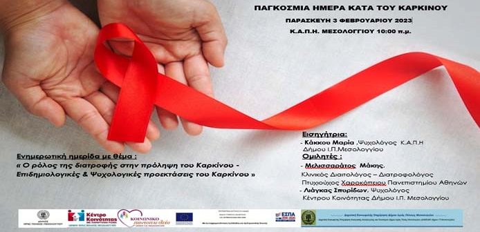 Ο Δήμος Ι.Π. Μεσολογγίου με αφορμή την «Παγκόσμια Ημέρα Κατά του Καρκίνου» η οποία είναι στις 4 Φεβρουαρίου και με την πρωτοβουλία των κοινωνικών δομών (Κέντρο Κοινότητας και Κοινωνικό Παντοπωλείο), που λειτουργούν στα πλαίσια του Επιχειρησιακού Προγράμματος «Δυτική Ελλάδα 2014-2020 με τη συγχρηματοδότηση της Ελλάδας και της Ευρωπαϊκής Ένωσης», θα πραγματοποιήσει ενημερωτική ημερίδα στην αίθουσα του ΚΑΠΗ, την Παρασκευή 3 Φεβρουαρίου 2023 και ώρα 10:00 π.μ., Η ημερίδα απευθύνεται στα μέλη του Κ.Α.Π.Η. και το θέμα της είναι :, «Ο ρόλος της διατροφής στην πρόληψη του Καρκίνου – Επιδημιολογικές & Ψυχολογικές προεκτάσεις του Καρκίνου»., Ομιλητές: