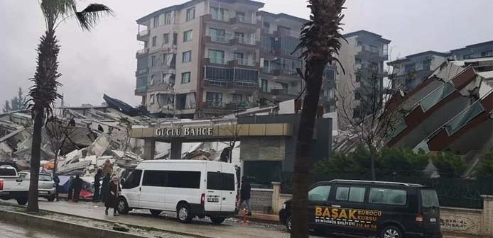 Στην Αντιόχεια, εξετάστηκε κτίριο 9 ορόφων που μετατράπηκε σε ένα βουνό από χαλάσματα. Μπροστά από τα συντρίμμια στέκει ακόμα η πινακίδα του κατασκευαστή: Guclu Bahce.