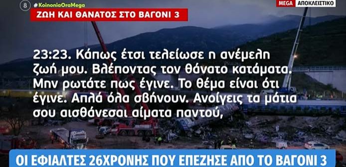 Υπήρχε καθυστέρηση στα Παλαιοφάρσαλα. Μας ενημέρωσαν ότι θα κάνουμε 20 λεπτά υποχρεωτική στάση, γιατί υπήρξε κάποιο πρόβλημα στις γραμμές. Όλοι στα βαγόνια αρχίσαμε να κάνουμε παράπονα. Εκεί φαίνεται να ακούστηκε το «πάμε και όπου βγει» που άκουσε επιβάτης από τον ασύρματο. Μετά βγήκε νέα ανακοίνωση ότι θα φτάναμε στη Θεσσαλονίκη 12.25. και πάλι ακούστηκαν παράπονα από τους επιβάτες. Το προσωπικό ήταν σε αναστάτωση αλλά δεν μας έλεγαν τον λόγο» είπε στο MEGA η 26χρονη που επέζησε από τη σύγκρουση τρένων στα Τέμπη.