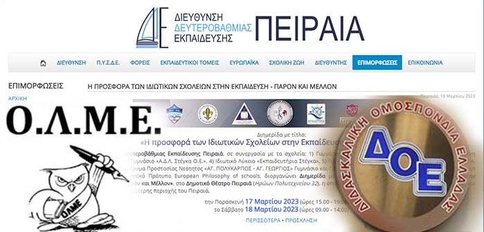 Ανακοινώσεις – καταγγελίες εξέδωσαν οι Συνδικαλιστικές Ομοσπονδίες Δευτεροβάθμιας Εκπαίδευσης & Πρωτοβάθμιας, ΟΛΜΕ & ΔΟΕ αντίστοιχα, για την διημερίδα που διοργανώνει η Διεύθυνση Β/θμιας Εκπαίδευσης Πειραιά σε συνεργασία με τα Ιδιωτικά Σχολεία της πόλης με θέμα: «Η προσφορά των Ιδιωτικών Σχολείων στην Εκπαίδευση-Παρόν και Μέλλον».