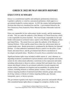 Μεταξύ άλλων το Στέιτ Ντιπάρτμεντ επισημαίνει ότι για την χώρα μας υπήρχαν αξιόπιστες αναφορές για «σκληρή, απάνθρωπη ή εξευτελιστική μεταχείριση ή τιμωρία κρατουμένων στις φυλακές και μεταναστών και αιτούντων άσυλο από τις αρχές επιβολής του νόμου και περιορισμοί στην ελευθερία της έκφρασης και των μέσων ενημέρωσης. Αναφέρει επίσης ότι υπάρχουν αναφορές για επαναπροωθήσεις και φερόμενη βία από τις κυβερνητικές αρχές έναντι μεταναστών και αιτούντων άσυλο, ανεπαρκής διερεύνηση και απόδοση ευθυνών για τη βία με βάση το φύλο, συμπεριλαμβανομένης της ενδοοικογενειακής βίας ή της βίας μεταξύ συντρόφων και για εγκλήματα που περιλαμβάνουν βία με στόχο μέλη εθνικών/φυλετικών/εθνικών μειονοτικών ομάδων.