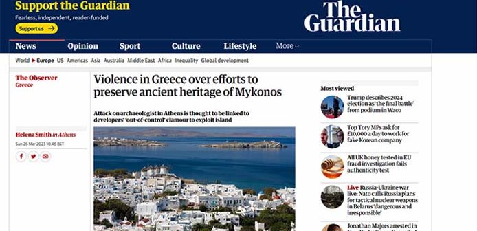 Εκτενές ρεπορτάζ για το «παρακράτος» που δρα στη Μύκονο δημοσίευσε από την Αθήνα η δημοσιογράφος Helena Smith του βρετανικού Guardian, σε σημερινό του άρθρο το οποίο τιτλοφορείται ως εξής: «Βία στην Ελλάδα κατά των προσπαθειών να διασωθεί η αρχαία κληρονομιά της Μυκόνου – Violence in Greece over efforts to preserve ancient heritage of Mykonos» . Το άρθρο της βρετανικής εφημερίδας πραγματοποιείται με αφορμή τον άγριο ξυλοδαρμό του Αρχαιολόγου Μανώλη Ψαρρού, με τον Guardian να κάνει λόγο για χαρακτηριστικά «επαγγελματικού χτυπήματος».