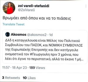 Σφοδρές αντιδράσεις έχει προκαλέσει σε όλη την κοινωνία αλλά και στις τάξεις του ΠΑΣΟΚ – Κίνημα Αλλαγής, η ανάρτηση της υποψήφιας του με τον ΣΥΡΙΖΑ στη Ανατ. Αττική Ζωής Βαρέλη Στεφανίδη -μητέρας της πρωταθλήτριας στο άλμα επί κοντώ Κατερίνας Στεφανίδη – με την οποία υιοθέτησε τα όσα χυδαία και εμετικά αναφέρει το πρωτοσέλιδο της εφημερίδας “Μακελειό” για την Ελένη Χρονοπούλου, τη δικηγόρο και στέλεχος του ΠΑΣΟΚ που κατήγγειλε για βιασμό και ξυλοδαρμό τον ευρωβουλευτή του ΣΥΡΙΖΑ Αλέξη Γεωργούλη.