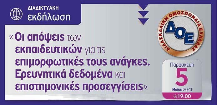 Σε αυτό το πλαίσιο πραγματοποιείται η 6η διαδικτυακή εκδήλωση για το 2023, την Παρασκευή 5 Μαΐου 2023 και ώρα 19:00, με τίτλο «Οι απόψεις των εκπαιδευτικών για τις επιμορφωτικές τους ανάγκες. Ερευνητικά δεδομένα και επιστημονικές προσεγγίσεις».