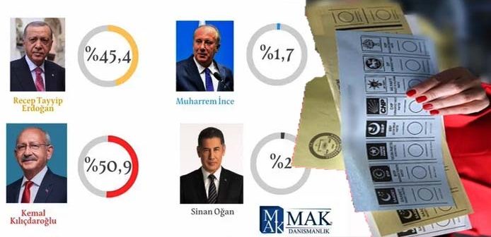 Λίγα 24ωρα πριν τις κρίσιμες εκλογές στην Τουρκία νέα δημοσκόπηση της MAK Consulting δείχνει ότι ο βασικός αντίπαλος του Ρετζέπ Ταγίπ Ερντογάν (Recep Tayyip Erdoğan), Κεμάλ Κιλιτσντάρογλου (Kemal Kılıçdaroğlu) όχι μόνο μπορεί να κερδίσει αλλά είναι πιθανό να το κάνει ακόμα και από την πρώτη Κυριακή.