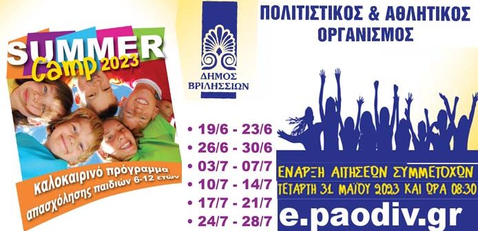 «Ο Δήμος Βριλησσίων μέσω του Πολιτιστικού & Αθλητικού Οργανισμού συνεχίζει για άλλο ένα καλοκαίρι το πρόγραμμα της θερινής δημιουργικής απασχόλησης για παιδιά ηλικίας 6-12 ετών. Το πρόγραμμα αυτό αποτελεί την ιδανική και ασφαλή λύση στην ανάγκη των εργαζόμενων γονιών να απασχολήσουν τα παιδιά τους τις ημέρες του καλοκαιριού, μετά τη λήξη του σχολικού έτους. Τα παιδιά μέσα από ένα εκπαιδευτικό, αθλητικό και ψυχαγωγικό πρόγραμμα, κοινωνικοποιούνται, αποκτούν εμπειρίες, ψυχαγωγούνται, δημιουργούν .