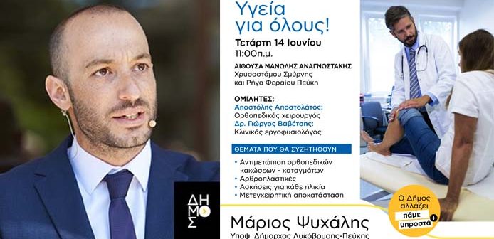Την Τετάρτη 14 Ιουνίου στις 11:00 το πρωί, στην αίθουσα Μανώλης Αναγνωστάκης (Ελ. Βενιζέλου 15α Πεύκη) στη Πεύκη θα πραγματοποιηθεί εκδήλωση της δημοτικής παράταξης του Δήμου Λυκόβρυσης Πεύκης, «δήμος μπροστά+» με επικεφαλής τον Μάριος Ψυχάλης και ομιλητές τον ιατρό – ορθοπεδικό Αποστόλη Αποστολάτο και τον Δρ. Γιώργο Βαβέτση, κλινικό εργοφυσιολόγο.