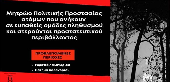 Ο Δήμος Χαλανδρίου, εφαρμόζοντας τις κατευθυντήριες οδηγίες της Γ.Γ. Πολιτικής Προστασίας για την οργανωμένη προληπτική απομάκρυνση πολιτών, για λόγους προστασίας από εξελισσόμενη ή επικείμενη καταστροφή εξαιτίας δασικών πυρκαγιών, και τις οδηγίες για τη σύνταξη ειδικών σχεδίων, στα πλαίσια εφαρμογής του αριθμ. 23 παρ. 4 του Ν. 4662/2020, προχωρά στη δημιουργία ενός Μητρώου Πολιτικής Προστασίας ατόμων που ανήκουν σε ευπαθείς ομάδες πληθυσμού (πχ. άτομα με κινητικά προβλήματα, τυφλοί, κωφοί, ασθενείς που μπορούν να μετακινηθούν μόνο με ασθενοφόρο κλπ.) και στερούνται προστατευτικού περιβάλλοντος.