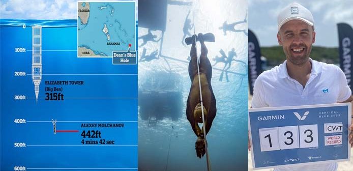 Ο 36χρονος ελεύθερος δύτης, που έχει ήδη στην κατοχή του 25 παγκόσμια ρεκόρ, πραγματοποίησε δύο καταδύσεις, την Παρασκευή και το Σάββατο, στο δεύτερο βαθύτερο θαλάσσιο σπήλαιο στον κόσμο, το Dean’s Blue Hole στις Μπαχάμες.