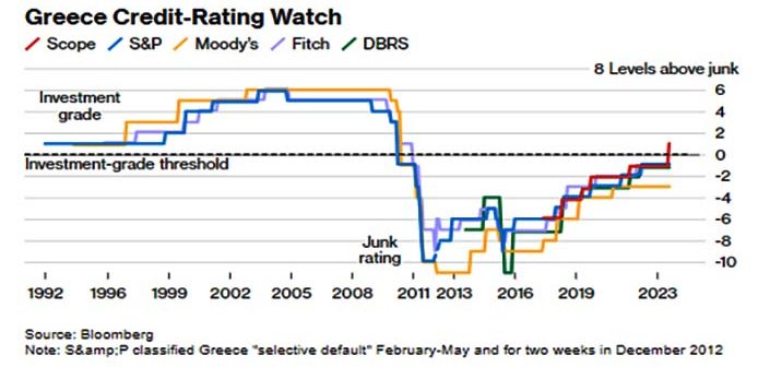 Την επιστροφή της Ελλάδας στην επενδυτική ελίτ καλωσορίζει το διεθνούς οικονομικού πρακτορείου ειδήσεων Bloomberg, μετά την αναβάθμιση από την Scope Ratings.