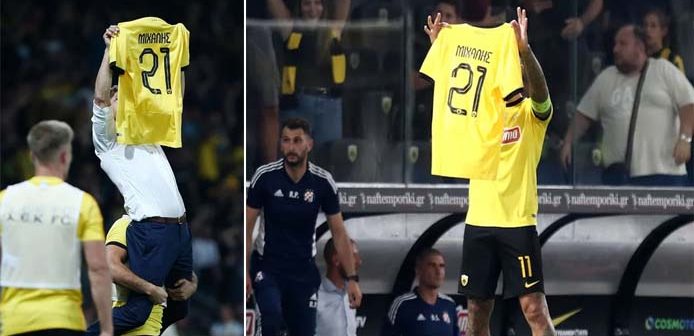 Ο Αργεντινός επιθετικός σχημάτισε με τα χέρια του το γράμμα «Μ» και στη συνέχεια πήγε στον πάγκο της Ένωσης για να πάρει μια φανέλα με το όνομα του Μιχάλη και τον αριθμό 21, την οποία έδειξε σε όλο το γήπεδο.