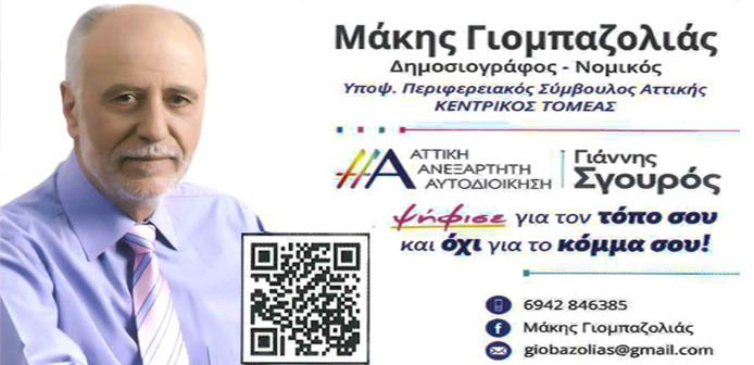 Με αυτήν την λογική και η σεμνή υποψηφιότητα του έμπειρου δημοσιογράφου, νομικού και αυτοδιοικητικού Μάκη Γιομπαζολιά, ως περιφερειακού συμβούλου Αττικής ,στον Κεντρικό Τομέα Αθήνας, με τον συνδυασμό “Αττική Ανεξάρτητη Αυτοδιοίκηση” του Γιάννη Σγουρού.