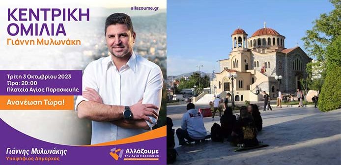 Ο επικεφαλής της δημοτικής παράταξης «Αλλάζουμε την Αγία Παρασκευή», και υποψήφιος Δήμαρχος, Γιάννης Μυλωνάκης και τα μέλη του ψηφοδελτίου του μας προσκαλούν στην Κεντρική Ομιλία του κ. Μυλωνάκη, που θα διεξαχθεί αύριο Τρίτη 3 Οκτωβρίου 2023, ώρα 20:00, στην Πλατεία της Αγίας Παρασκευής, για «να δώσουμε μαζί τον τόνο της ανανέωσης και της αλλαγής στην πόλη. Να είμαστε όλοι εκεί να γίνει η Ανανέωση πράξη!», όπως αναφέρει η παράταξη
