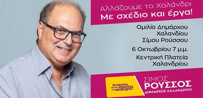 Κεντρική προεκλογική ομιλία Δημάρχου Χαλανδρίου Σίμου Ρούσσου αύριο Παρασκευή 6 Οκτωβρίου 2023 στην κεντρική πλατεία