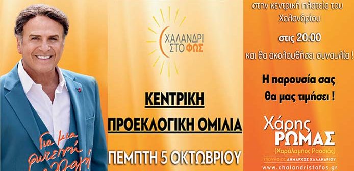 Ο Υποψήφιος δήμαρχος Χάρης Ρώμας Επικεφαλής του συνδυασμού «Χαλάνδρι στο φως», προσκαλεί όλους τους δημότες στην κεντρική προεκλογική του ομιλία την Πέμπτη 5/10/2023 και ώρα 20:00 στην κεντρική πλατεία Χαλανδρίου.