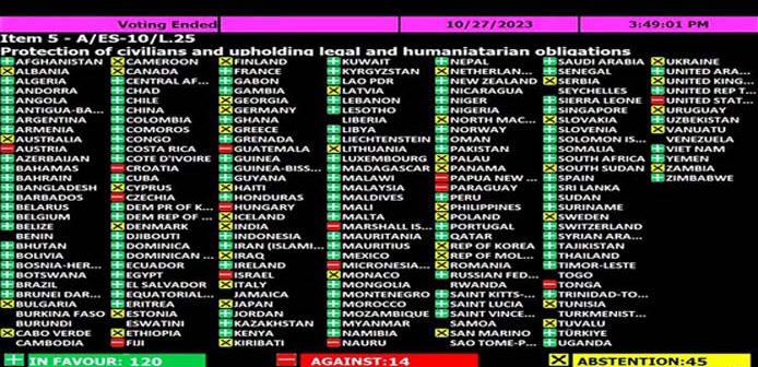 «Σήμερα είναι μια μέρα ντροπής. Όλοι έχουμε γίνει μάρτυρες ότι o OHE δεν έχει πλέον ούτε μια ουγγιά νομιμότητας ή συνάφειας» ήταν η αντίδραση του πρεσβευτή του Ισραήλ στον ΟΗΕ Γκιλάντ Ερντάν (Gilad Erdan) ο οποίος χαρακτήρισε «ντροπή» το γεγονός ότι η Γενική Συνέλευση του Οργανισμού ενέκρινε ψήφισμα που ζητά μια «ανθρωπιστική εκεχειρία» στη Λωρίδα της Γάζας, χωρίς να αναφέρεται στο κείμενο η Χαμάς.