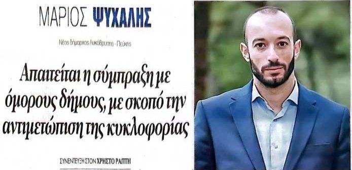 Συνέντευξη στην εφημερίδα «ΤΑ ΝΕΑ» και το δημοσιογράφο Χρήστο Ράπτη έδωσε ο νέος δήμαρχος Λυκόβρυσης – Πεύκης, Μάριος Ψυχάλης, στην οποία αναφέρθηκε στην αντιμετώπιση της καθημερινότητας, την τεχνολογική πρόοδος ενσωματώνει την επιχειρηματική ευφυία, την τοπική επιχειρηματικότητα, την ποιότητα ζωής των κατοίκων και τις μελλούμενες συνεργασίες με την Περιφέρεια Αττικής, τα αρμόδια Υπουργεία και την ακαδημαϊκή και επιχειρηματική κοινότητα.