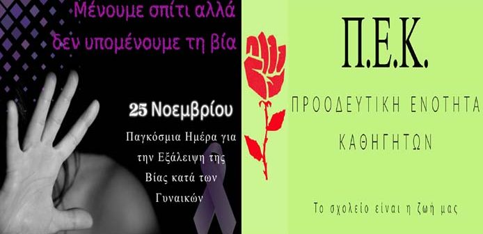 Η συνδικαλιστική παράταξη της Ομοσπονδίας Λειτουργών Μέσης Εκπαίδευσης (ΟΛΜΕ), Προοδευτική Ενότητα Καθηγητών (ΠΕΚ) με ανακοίνωσή της αναφέρεται στην Παγκόσμια Ημέρα για την Εξάλειψη της βίας κατά των Γυναικών και τονίζει χαρακτηριστικά «Η σιωπή δεν είναι η απάντηση. Κοινωνία και Πολιτεία οφείλουν να διαμορφώσουν μια νέα πραγματικότητα όπου δεν θα γίνεται ανεκτό κανένα περιστατικό έμφυλης βίας.»