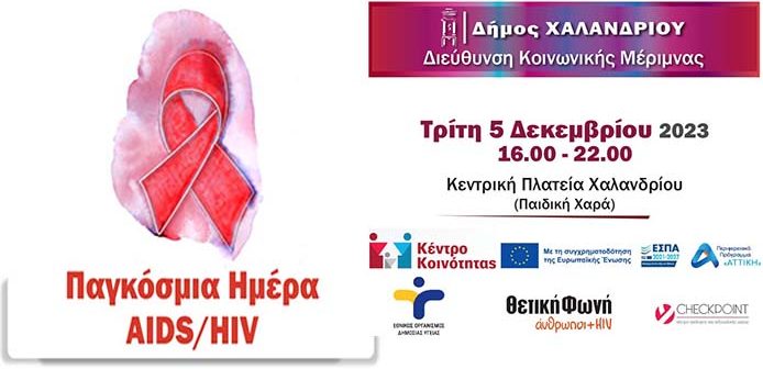 Δράση ενημέρωσης και πρόληψης για τον HIV διοργανώνουν το Κέντρο Κοινότητας του Δήμου Χαλανδρίου και το Τμήμα Κοινωνικής Μέριμνας, Εποπτείας Εθελοντισμού & Πολιτικών Ισότητας των δύο φύλων, σε συνεργασία με τον Εθνικό Οργανισμό Δημόσιας Υγείας (ΕΟΔΥ) και το Σύλλογο Οροθετικών Ελλάδας- Θετική Φωνή, στα πλαίσια της Παγκόσμιας Ημέρας AIDS/HIV, την 1η Δεκεμβρίου.