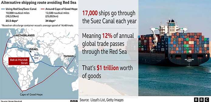 Αναμένονται καθυστερήσεις στα προϊόντα που φτάνουν στα καταστήματα, με πλοία μεταφοράς εμπορευματοκιβωτίων λόγω της 10ημερης καθυστέρησης μέσω του ακρωτηρίου της Καλής Ελπίδας, που προσθέτει περίπου 3.500 ναυτικά μίλια και αυτυό θα έχει σημαντικό κόστος στις εταιρείες