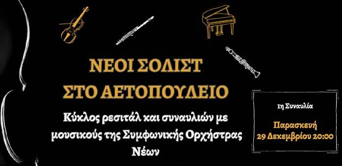 Ένας νέος κύκλος μουσικών εκδηλώσεων με τον τίτλο «Νέοι σολίστ στο Αετοπούλειο» ανοίγει την Παρασκευή 29 Δεκεμβρίου, στις 8.00 μ.μ., στο Αετοπούλειο Πολιτιστικό Κέντρο, με το ρεσιτάλ πιάνου του Δημήτρη Καλδή, σε έργα Schumann, Beethoven, Debussy και Mendelssonh.