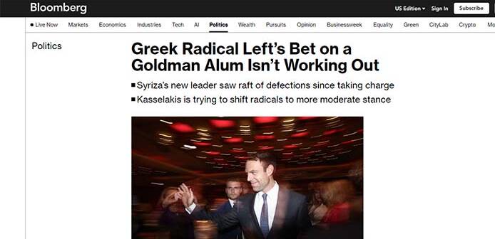 Με τίτλο «Το στοίχημα της Ελληνικής Ριζοσπαστικής Αριστεράς σε στυπτηρία Goldman δεν λειτουργεί», σχολίαzei το Bloomberg την αμφιλεγόμενη ανάληψη της προεδρίας του ΣΥΡΙΖΑ, του κόμματος της αξιωματικής αντιπολίτευσης από τον Στέφανο Κασελάκη.