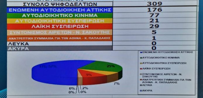 - Συνδυασμός Γ. Μαρκόπουλου: «ΕΝΩΜΕΝΗ ΑΥΤΟΔΙΟΙΚΗΣΗ ΑΤΤΙΚΗΣ» 176 ψήφους / 16 έδρες