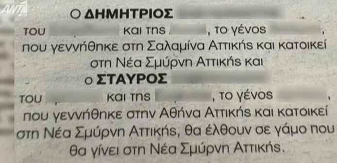 «Ο Δημήτριος xxxx του xxxx και της xxxx, το γένος xxxx, που γεννήθηκε στη Σαλαμίνα Αττικής και κατοικεί στη Νέα Σμύρνη Αττικής και ο Σταύρος xxxxx, του xxxx και της xxxx, το γένος xxxx, που γεννήθηκε στην Αθήνα Αττικής και κατοικεί στη Νέα Σμύρνη Αττικής, θα έλθουν σε γάμο που θα γίνει στη Νέα Σμύρνη Αττικής», αναφέρει η αναγγελία γάμου.