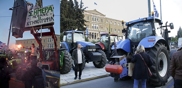 Μπροστά από το Κοινοβούλιο, η Λεωφόρος Βασιλίσσης Σοφίας είναι γεμάτη από τρακτέρ και επαγγελματικά οχήματα και ο κόσμος πολύς, αφού στους διαδηλωτές έχουν προστεθεί ομοσπονδίες, σωματεία και συνδικάτα εργαζομένων από δεκάδες τομείς, που βρίσκονται στο Σύνταγμα για να συμπαρασταθούν στους αγρότες, τους οποίους υποδέχτηκαν με το σύνθημα: “Εργατιά, αγροτιά ενωμένοι μια γροθιά”.