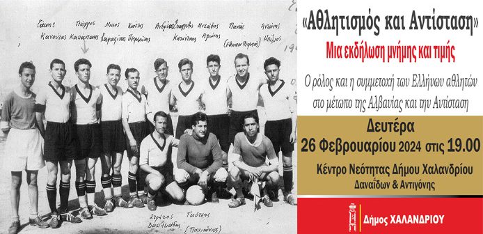Ο Δήμος Χαλανδρίου και η πρωτοβουλία φιλάθλων «Επίσκυρον» διοργανώνει την εκδήλωση «Αθλητισμός και Αντίσταση», τη Δευτέρα 26 Φεβρουαρίου 2024, στις 19.00, στο Κέντρο Νεότητας του Δήμου Χαλανδρίου (Δαναΐδων & Αντιγόνης), με στόχο να φωτιστεί ο ρόλος και η συμμετοχή των Ελλήνων αθλητών στο μέτωπο της Αλβανίας αλλά και στις πράξεις αντίστασης, αλληλεγγύης και στήριξης του δοκιμαζόμενου λαού, κατά τη διάρκεια της Κατοχής.