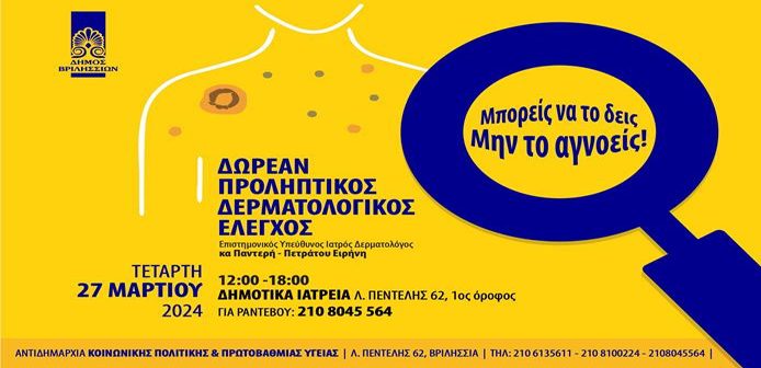 Ο Δήμος Βριλησσίων μέσω της Αντιδημαρχίας Κοινωνικής Πολιτικής και Πρωτοβάθμιας Φροντίδας Υγείας διενεργεί δωρεάν προληπτικό δερματολογικό έλεγχο για όλους τους συμπολίτες μας στα Δημοτικά Ιατρεία (Λ. Πεντέλης 62, 1ος όροφος) την Τετάρτη 27 Μαρτίου 2024 από τις 12 το μεσημέρι έως τις 6 το απόγευμα.