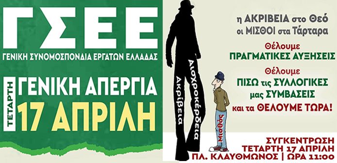 Την ημέρα της απεργίας της 17ης Απριλίου, η ΓΣΕΕ καλεί στις 11 το πρωί σε συλλαλητήριο στην πλατεία Κλαυθμώνος και το ΠΑΜΕ μισή ώρα νωρίτερα στο Σύνταγμα. Στην κινητοποίηση συμμετέχουν οι εργαζόμενοι στον ιδιωτικό και τον ευρύτερο Δημόσιο τομέα. Στις 5 το απόγευμα, στο Πεδίον του Άρεως, έχει προγραμματιστεί συγκέντρωση και μοτοπορεία των διανομέων στο κέντρο της Αθήνας.