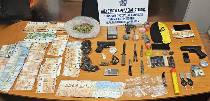 Κατασχέθηκαν -183,37- γραμμ. ακατέργαστης κάνναβης, -2- αεροβόλα πιστόλια, ξιφολόγχη, -5- μαχαίρια, ναυτική φωτοβολίδα και -12.667- ευρώ
