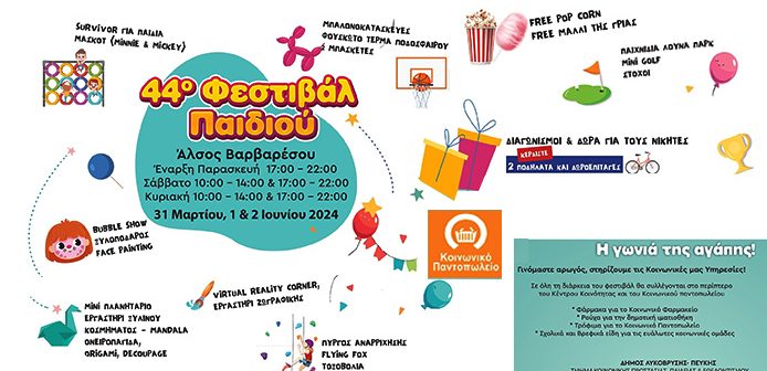 Η έναρξη του 44ου Φεστιβάλ Παιδιού θα γίνει την Παρασκευή 31 Μαΐου στις 17:00, με την πρώτη ημέρα να ολοκληρώνεται στις 22:00. Το Σάββατο 1 Ιουνίου και την Κυριακή 2 Ιουνίου το Άλσος Βαρβαρέσου θα υποδεχθεί μικρούς και μεγάλους από τις 10:00 μέχρι τις 14:00 και από τις 17:00 μέχρι τις 22:00.