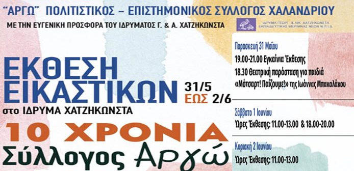 Ο Πολιτιστικός – Επιστημονικός Σύλλογος Χαλανδρίου «ΑΡΓΩ» με αφορμή τα 10 χρόνια λειτουργίας του μας προσκαλεί την Παρασκευή 31 Μαΐου, το Σάββατο 1η και την Κυριακή 2 Ιουνίου 2024, στη μεγάλη Έκθεση Εικαστικών με 36 συμμετοχές που διοργανώνει ο Σύλλογος