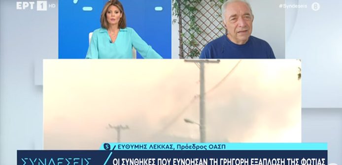 Για τις συνθήκες που ευνόησαν τη γρήγορη εξάπλωση της φωτιάς στην Αττική και την δυσκολία κατάσβεσής της, μίλησε ο πρόεδρος του ΟΑΣΠ, Ευθύμιος Λέκκας, στην εκπομπή της ΕΡΤ «ΣΥΝΔΕΣΕΙΣ» και τη δημοσιογράφο, Χριστίνα Βίδου, ο οποίος αναφέρθηκε στο φαινόμενο των κηλιδώσεων και στο πώς συνετέλεσαν στην εξάπλωση της πυρκαγιάς οι παρατεταμένες περίοδοι ανομβρίας και οι υψηλές θερμοκρασίες.