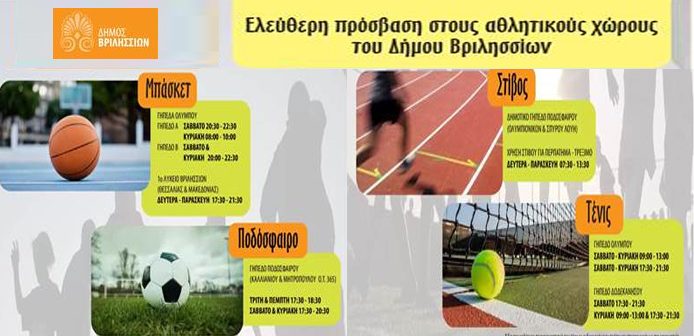 Με γνώμονα τη δημιουργία περισσότερων ευκαιριών για την άθληση των συμπολιτών μας, κάθε ηλικίας, ο Δήμος Βριλησσίων δίνει τη δυνατότητα ελεύθερης πρόσβασης στις δημοτικές αθλητικές εγκαταστάσεις.