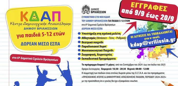 Η Αντιδημαρχία Οικογενειακής Πολιτικής, Ισότητας και Προσχολικής Ηλικίας του Δήμου Βριλησσίων ενημερώνει τους γονείς και τους κηδεμόνες που επιθυμούν να εγγράψουν τα παιδιά τους στο Κέντρο Δημιουργικής Απασχόλησης Παιδιών (ΚΔΑΠ) 5-12 ετών για το σχολικό έτος 2024-2025 ότι οι αιτήσεις θα υποβάλλονται ηλεκτρονικά στο mail: kdap@vrilissia.gr από 9/9/2024 έως 20/9/2024 και ώρα 23:59 με την ένδειξη «Αίτηση εγγραφής στο ΚΔΑΠ 5-12».