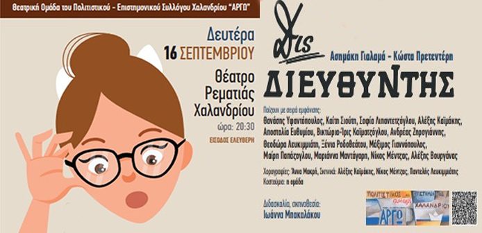 Η Θεατρική Ομάδας του Πολιτιστικού – Επιστημονικού Συλλόγου «ΑΡΓΩ» Χαλανδρίου, παρουσιάζει τη ΔΕΥΤΕΡΑ 16 Σεπτεμβρίου ώρα 20.30, στο Θέατρο Ρεματιάς , την αγαπημένη κωμωδία «Δεσποινίς Διευθυντής» σε σκηνοθεσία Ιωάννας Μπακαλάκου