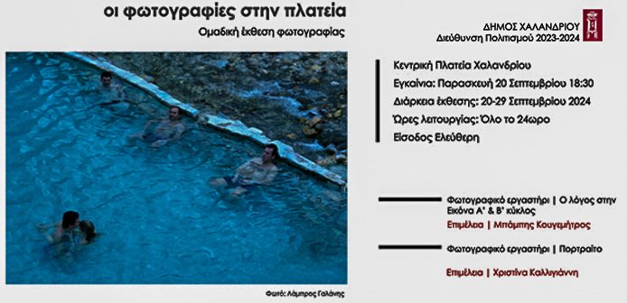 Με τη συμμετοχή 35 ερασιτεχνών φωτογράφων, κατοίκων της πόλης του Χαλανδρίου, ξεκινά την Παρασκευή 20 Σεπτεμβρίου, στις 18.30 στον χώρο της παιδικής χαράς στην κεντρική πλατεία, η έκθεση «Η φωτογραφία στην πλατεία», που διοργανώνει ο Δήμος Χαλανδρίου.