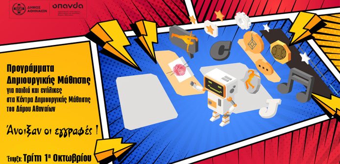 Ο Δήμος Αθηναίων εγκαινιάζει τη νέα περίοδο Προγραμμάτων Δημιουργικής Μάθησης από την Τρίτη, 1η Οκτωβρίου. Μέσα από τα δώδεκα Κέντρα Δημιουργικής Μάθησης του Οργανισμού Πολιτισμού, Αθλητισμού και Νεολαίας Δήμου Αθηναίων (ΟΠΑΝΔΑ), τα οποία βρίσκονται σε ισάριθμες γειτονιές της πόλης, προσφέρονται δραστηριότητες για όλες τις ηλικίες, σχεδιασμένες για να ανταποκρίνονται στις σύγχρονες ανάγκες των πολιτών και να ακολουθούν τις τάσεις της εποχής.