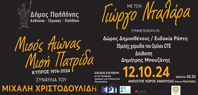 «1974 – 2024: Μισός αιώνας – Μισή πατρίδα» – Συναυλία μνήμης για τη μαύρη επέτειο της Κύπρου με τον Γιώργο Νταλάρα διοργανώνει ο Δήμος Παλλήνης στην Ανθούσα – Είσοδος ελεύθερη