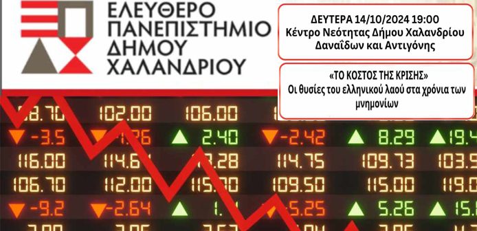 Η πρώτη διάλεξη θα γίνει τη Δευτέρα 14 Οκτωβρίου με ένα σημαντικό θέμα: «ΤΟ ΚΟΣΤΟΣ ΤΗΣ ΚΡΙΣΗΣ» και πολύ σημαντικούς ομιλητές/τριες. Σε αυτήν θα παρουσιαστούν τα αποτελέσματα έρευνας σχετικά με το πόσο κόστισαν τα μνημόνια στο κράτος, την κοινωνία, την οικογένεια και τα άτομα.