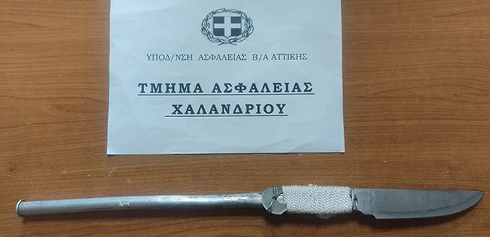 «Συνελήφθη 49χρονος αλλοδαπός ο οποίος κρατώντας αυτοσχέδια κατασκευή αποτελούμενη από μαχαίρι δεμένο σε σίδερο ακολουθούσε απειλητικά -3- ανηλίκους στο Χαλάνδρι